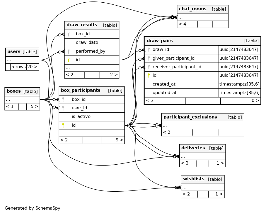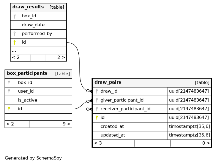 | uq_draw_pairs_giver | Must be unique | Asc/Asc | draw_id + giver_participant_id |