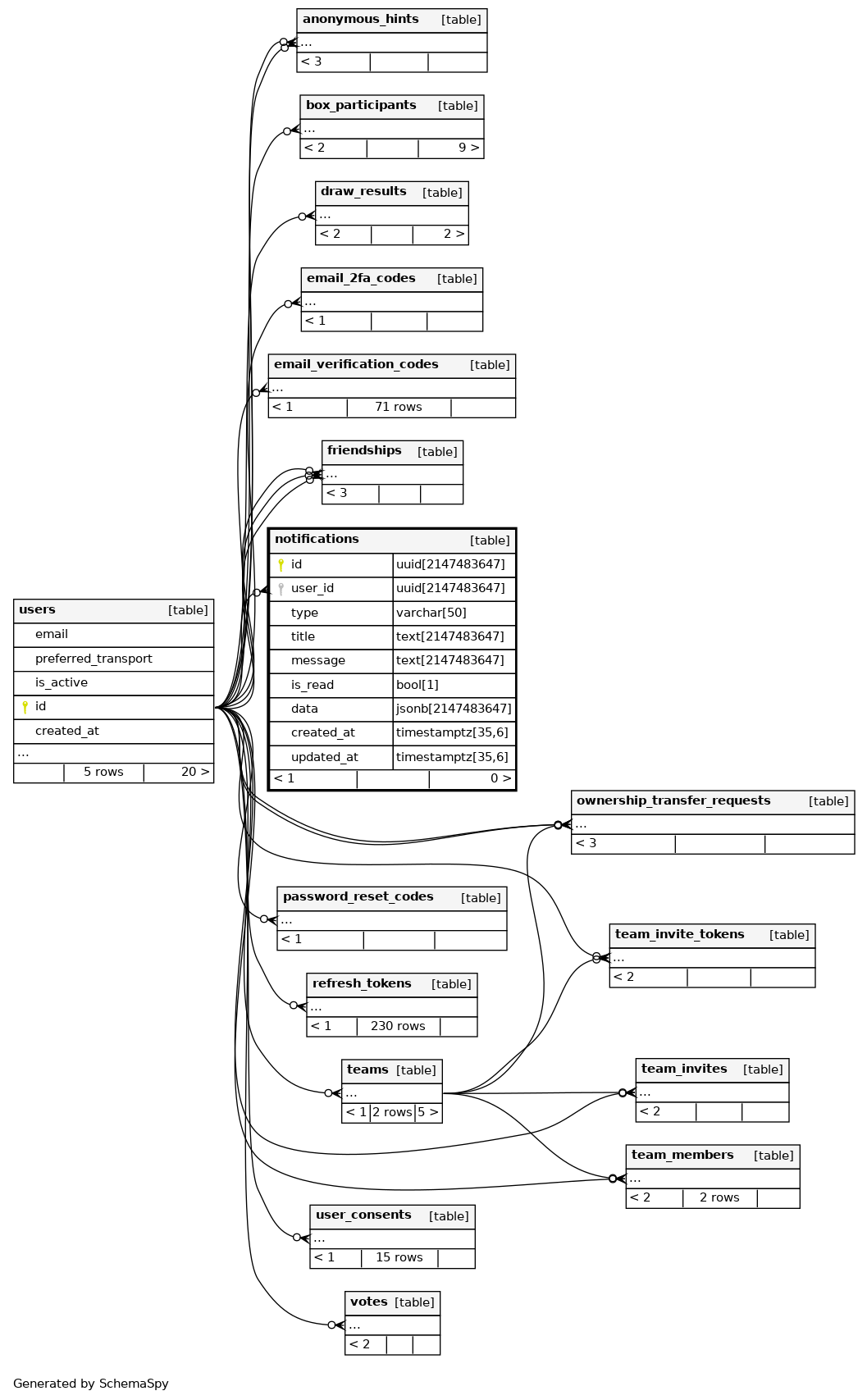 | chk_notifications_type | ((type)::text = ANY ((ARRAY['email'::character varying, 'draw_result'::character varying, 'invite'::character varying, 'message'::character varying, 'gift_sent'::character varying, 'gift_received'::character varying, 'vote'::character varying])::text[])) |
