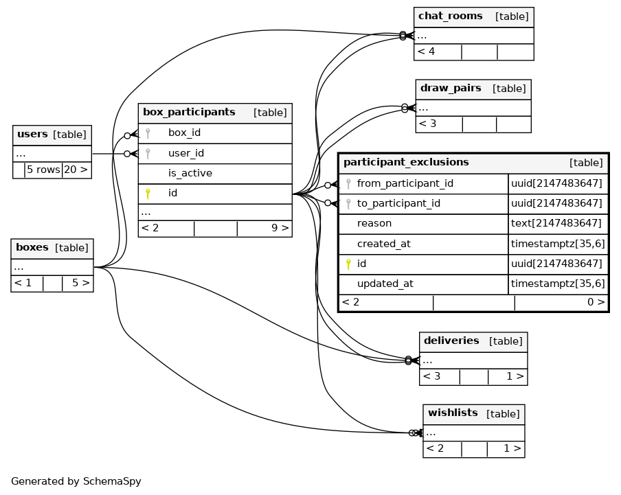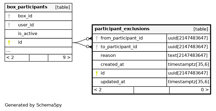 | uq_exclusions_from_to | Must be unique | Asc/Asc | from_participant_id + to_participant_id |